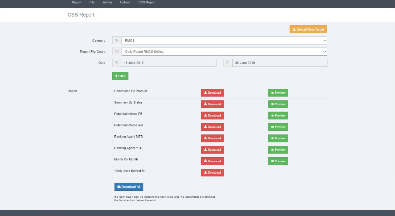 This project name is CSS Report or Core Sales Support Report. This project given the internal user to generating reports from browser to become excel worksheet where user must input some parameter like category, file group, and date range. After that, the reports list will shown based on relation group, and the contain of reports generated based on date range after clicked. Besides that, the reports will generated automatically on 5 A.M every day and they will sent to email if the reports size less than 5MB or server if the reports size more than 5MB.